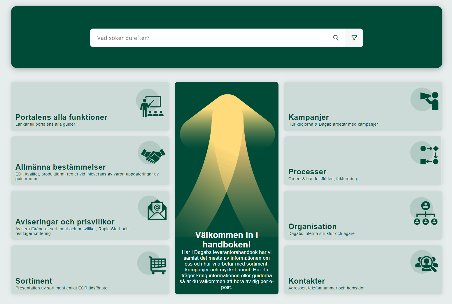 Inom en bransch där kvalitet och effektiv logistik är av högsta betydelse har Dagab (en del av Axfood) effektiviserat genom att skapa en specifik portalsida som riktar sig till sina leverantörer. Portalen har utformats med användarvänlighet i åtanke och används idag av över 2000 externa användare som är leverantörer till bl.a. Willys, Hemköp, City Gross, Tempo och Snabbgrossen. Utöver leverantörerna nyttjas även portalen av ett hundratal interna Dagab-användare. Portalen erbjuder tydlig kategorisering och innehåller guider som spänner över allt från prisvillkor och kampanjer till order- och handelsflöden mellan Dagab och dess leverantörer.